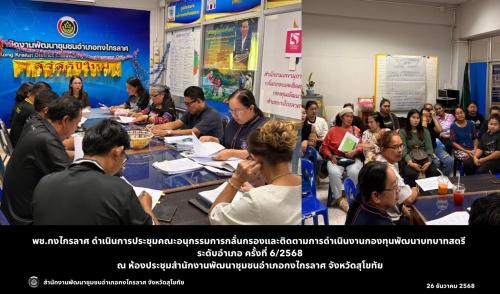 ⚫️ สำนักงานพัฒนาชุมชนอำเภอกงไกรลาศ นำโดย นางวิภาดา ไกรกิจราษฎร์ พัฒนาการอำเภอ พร้อมด้วย นางเยาวลักษณ์ ปรีชาเวทยากุล นักวิชาการพัฒนาชุมชนชำนาญการ ดำเนินการประชุมคณะอนุกรรมการกลั่นกรองและติดตามการดำเนินงานกองทุนพัฒนาบทบาทสตรี ระดับอำเภอ ครั้งที่ 6/2568 โดยมีวาระสำคัญ ดังนี้