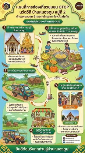 ⚫️ สำนักงานพัฒนาชุมชนอำเภอกงไกรลาศ ขอเชิญท่องเที่ยวชุมชน OTOP นวัตวิถี กับแผนที่ท่องเที่ยวชุมชนบ้านหนองตูม หมู่ที่ 2 ตำบลหนองตูม อำเภอกงไกรลาศ จังหวัดสุโขทัย ➡️ เริ่มที่✨สักการะพระคู่เมือง แหล่งศูนย์รวมจิตใจ พระศรีศากยมุนี ➡️ เดินทางไปกับ🚜รถไถน้อยเพื่อสัมผัสวิถีชีวิต ➡️ แวะเยี่ยมชม🍌แหล่งแปรรูปผลิตภัณฑ์จากผลิตผลพื้นถิ่น➡️ อุดหนุนชุมชนด้วย🎏ของฝากสินค้า OTOP ที่หลากหลาย อุดมด้วยคุณภาพ➡️ และแวะจุดเช็ดอิน 🎏ตลาดริมยม และ✨วัดกงไกรลาศ